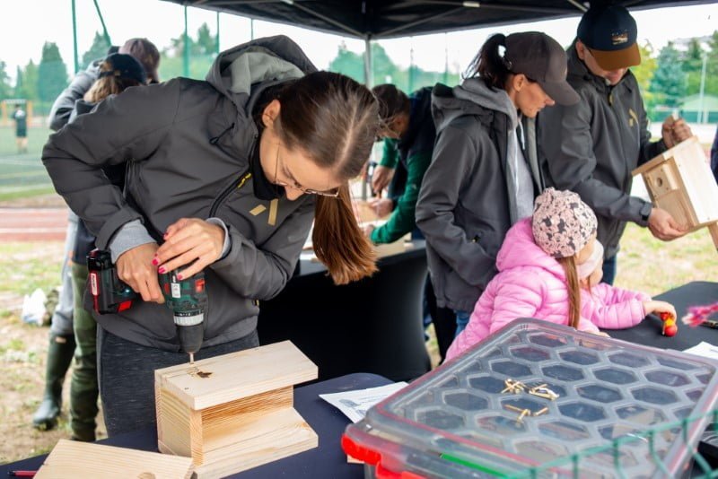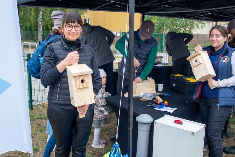 Część praktyczna warsztatów polegała na samodzielnym skręcaniu budek dla ptaków, co było dobrą okazją do trenowania umiejętności manualnych, szczególnie dla dzieci.