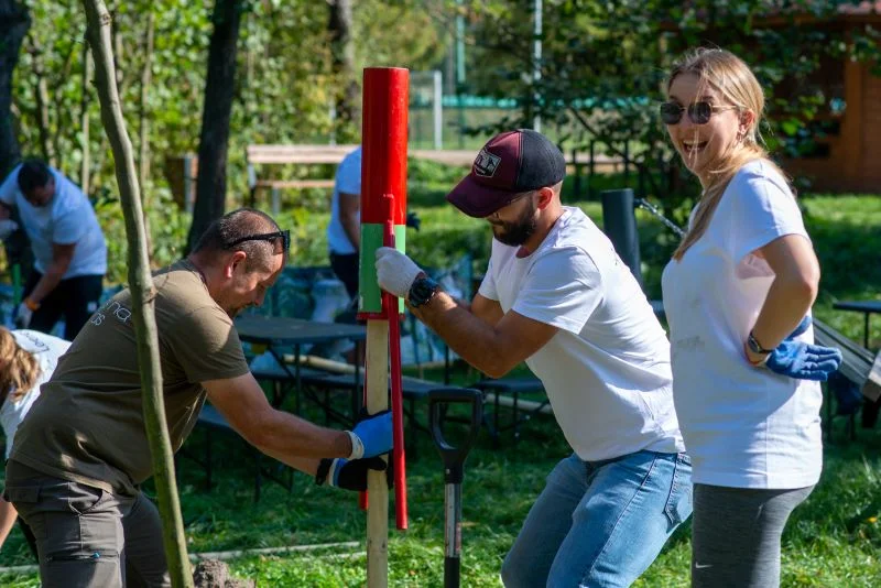 Sadzenie dużych drzew to zdecydowanie spore wyzwanie, które wymaga nie tylko więcej pracy, ale także uważności w działaniu oraz wiedzy na temat przebiegu całego procesu. Wolontariusze przy tej okazji nauczyli się poprawnego palikowania, wykorzystując kafar, czyli urządzenie do palowania. W pocie czoła, ale w miłej atmosferze posadziliśmy razem 14 grabów mierzących ok. 6-7 metrów, a następnie drzewa zostały zabezpieczone przed działalnością psów.