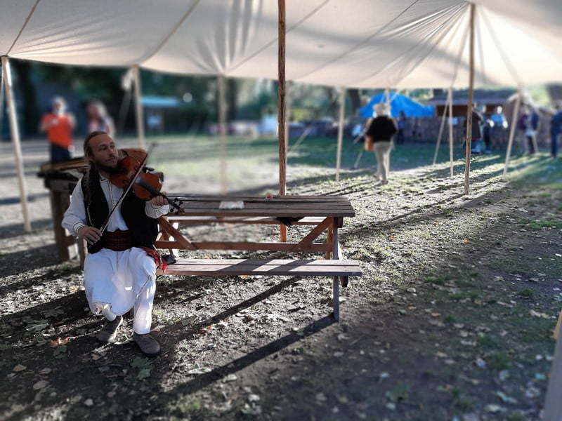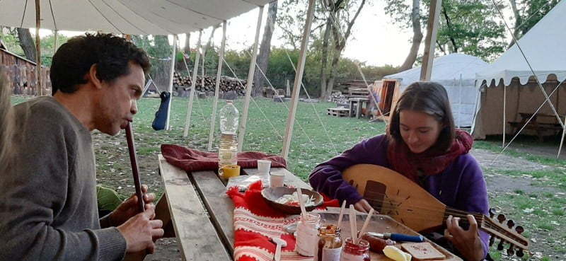 Joanna: Uwielbiam tradycyjną muzykę polskich nizin i wschodniokarpackich dolin, cieszę się, kiedy dzięki wirującym tańcom mogę rozpływać się w zapomnieniu, ale także kiedy mogę swoje umiejętności przekazywać osobom, które dopiero wchodzą w te świat. A możliwość doświadczania kultury w bliskości z naturą tak jak to miało miejsce w Wiosce Żywej Archeologii dopełnia moje poczucie radości.