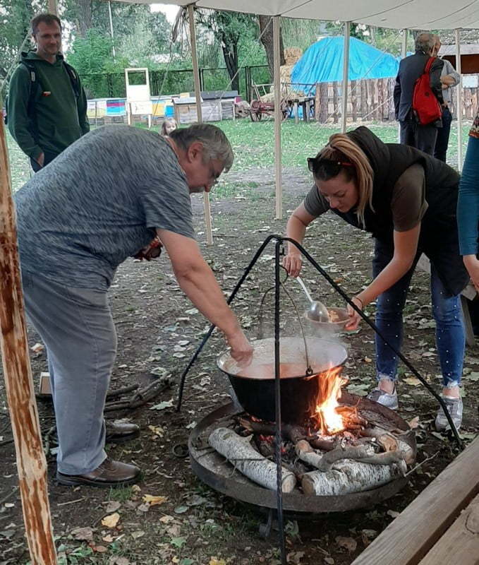 Jola: Gotowanie z Karolem jednego z hitów węgierskiej kuchni to było coś. Do tego w wielkim kotle, nad paleniskiem! Leczo, czyli kompozycja pomidorów, papryki i cebuli, wyszło palce lizać. Lubimy je, przypomina nam ojczyznę Karola 🙂 I jeszcze dwóch śpiewających i tańczących muzykę Csángó Węgrów – Gergo i Farkas. Byli świetni.