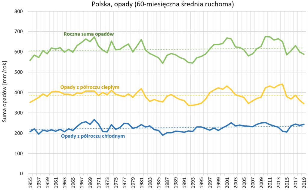 Zapisy poziomu opadów od mniej więcej stu pięćdziesięciu lat wskazują na zupełnie inne – od powszechnie dziś głoszonych – fakty na temat opadów w naszej części świata. Może to niejednego zaskoczyć, lecz poziom opadów był mniej więcej taki sam przez te kilkanaście dekad. Badacze znajdują w historii opadów pewne prawidłowości. Cykle mokrych lat przeplatają się od początku z suchymi seriami. Lecz średnio, w dłuższej perspektywie, pada na naszym terytorium wciąż tyle samo. W górach ponad 1000 mm rocznie, niżej na Pogórzu – między 800 a 1000, a na niżu – między 500 a 800 w zależności od regionu. Zmienność w każdym z przedziałów sięga 100-150 mm w cyklu wieloletnim.